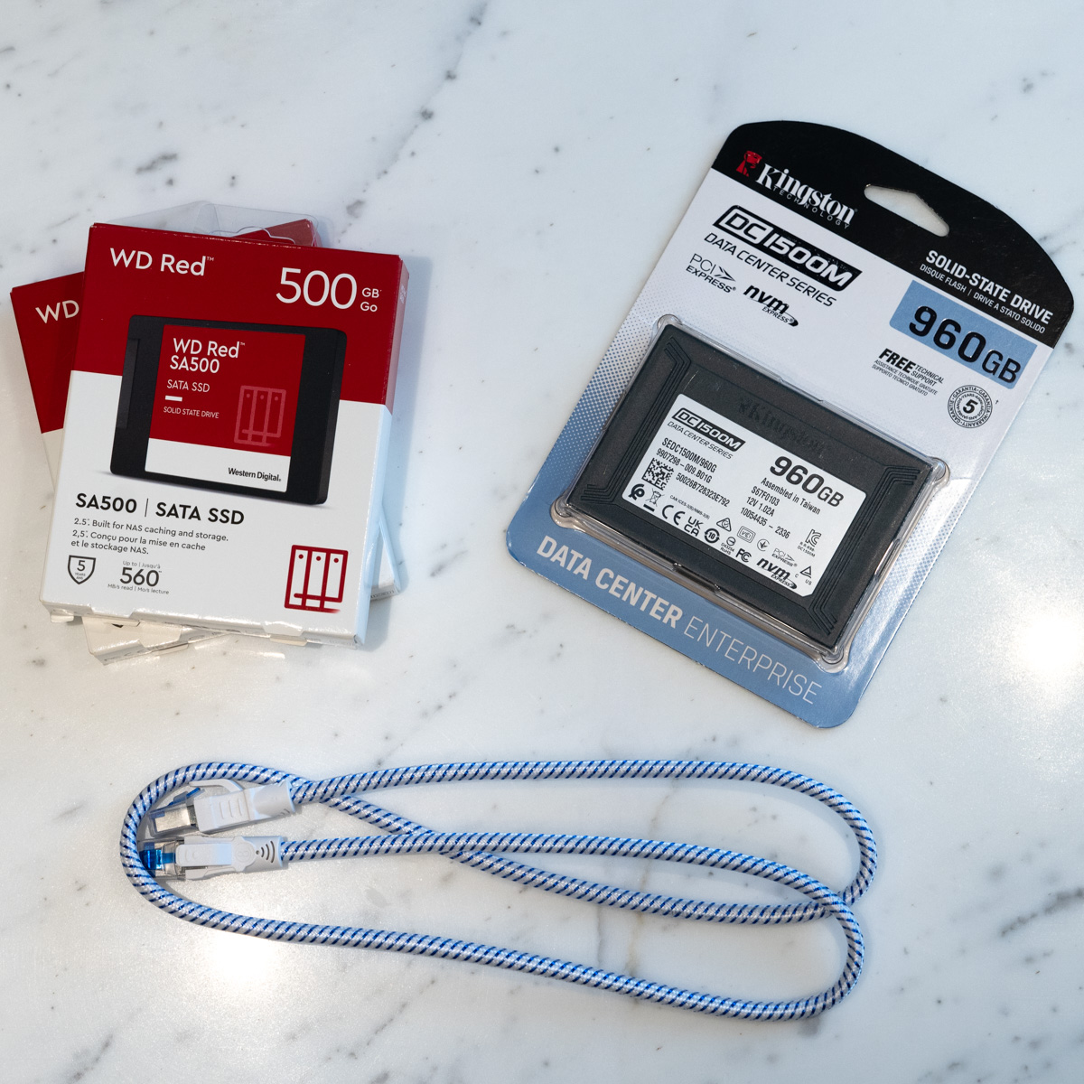 Per il momento, a causa dei costi, ho alloggiato solamente 3 dei 5 slot Hdd con dischi WD red plus da 14 tb, per un totale di 42tb, 2 ssd da 500gb per un totale di 1tb e un ssd u.2 nvme da 960gb.